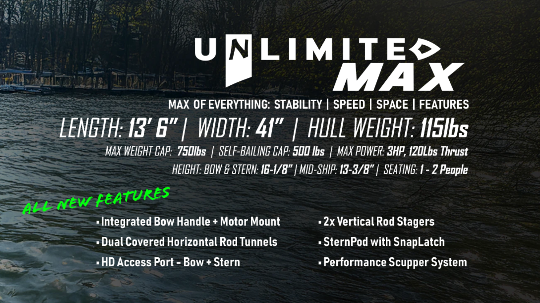 Engineered to dominate all waters, the Unlimited Max puts total control in your hands. Featuring our most advanced hull design to date, it strikes the perfect balance between elite speed and unmatched stability across any water. With a massive open deck and industry-leading weight capacity, your rigging possibilities are truly infinite.